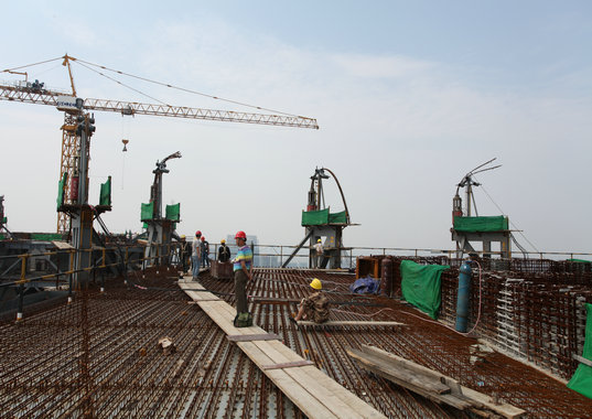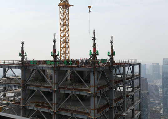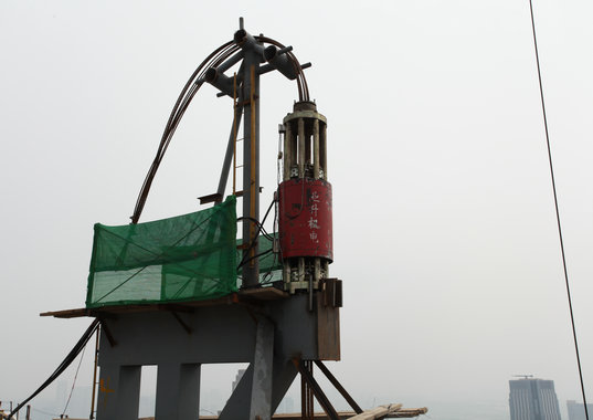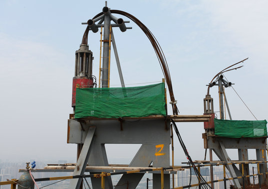 領(lǐng)地·環(huán)球金融中心連廊吊裝主要采用的“超大型構(gòu)件液壓同步提升技術(shù)”。該技術(shù)屬于國家頒布的《建筑業(yè)10項新技術(shù)》中第五項:鋼結(jié)構(gòu)與大型設(shè)備計算機控制整體頂升與提升安裝施工技術(shù)。這是一項先進的鋼結(jié)構(gòu)與大型設(shè)備安裝技術(shù),它集機械、液壓、計算機控制、傳感器監(jiān)測等技術(shù)于一體,解決了傳統(tǒng)吊裝工藝和大型起重機械在起重高度、起重重量、結(jié)構(gòu)面接、作業(yè)場地等方面無法克服的難題。采用該技術(shù)施工安全可靠、工藝成熟、技術(shù)先進、經(jīng)濟效益顯著。本次吊裝使用的“超大型構(gòu)件液壓同步提升技術(shù)”采用液壓提升器作為提升機具,柔性鋼絞線作為承重索具。液壓提升器為穿芯式結(jié)構(gòu),以鋼絞線作為提升索具,具有安全、可靠、承重件自身重量輕、運輸安裝方便、中間不必鑲接等一系列獨特優(yōu)點。一共采用了8臺YS-SJ-405型液壓提升器和配套8臺YS-PP-50型液壓泵源系統(tǒng),由YS-CS-01型計算機同步控制及傳感檢測系統(tǒng)同時控制。鋼絞線114根,總長22800米。