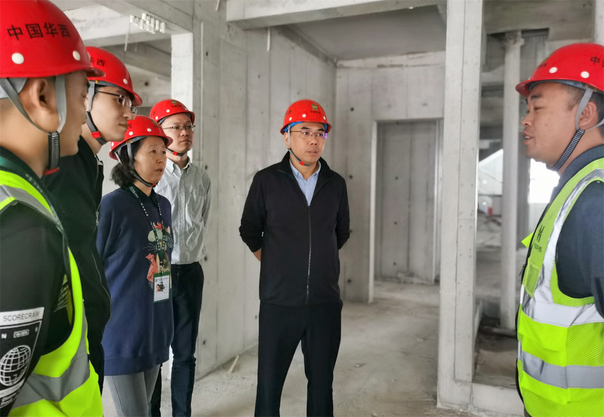 在德陽新豐棚改項目,胡銳一行首先參觀了項目建筑沙盤模型,聽取了項目管理人員對工程概況、施工進度、安全質量管控等方面情況的介紹,全面了解了新豐老街安置配套小區(qū)的基本概況、裝配率以及奮戰(zhàn)四季度產(chǎn)值目標完成情況。調研過程中,胡銳對項目現(xiàn)階段施工進度、安全管理、施工質量表示了肯定,要求項目部在施工生產(chǎn)過程中要嚴格按照外墻防滲漏專項施工方案內容進行施工,在加強與公司各項目溝通交流的同時做好細節(jié)及品質提升工作,把華西品牌推廣出去,將德陽新豐棚改項目打造成德陽片區(qū)有影響力的精品工程。