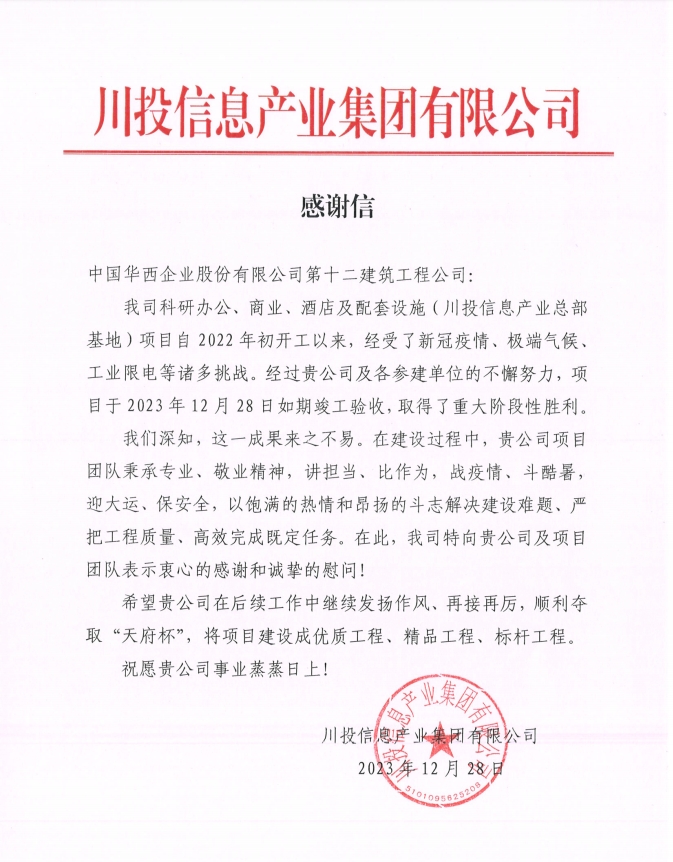 12月28日,川投信息產(chǎn)業(yè)集團有限公司向華西十二公司送來一份感謝信,信中對公司承建的川投信息產(chǎn)業(yè)總部基地項目的建設(shè)工作及面對諸多挑戰(zhàn)仍如期竣工給予了充分肯定和衷心感謝。