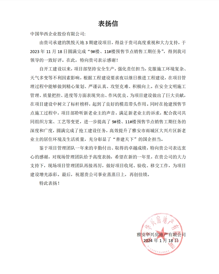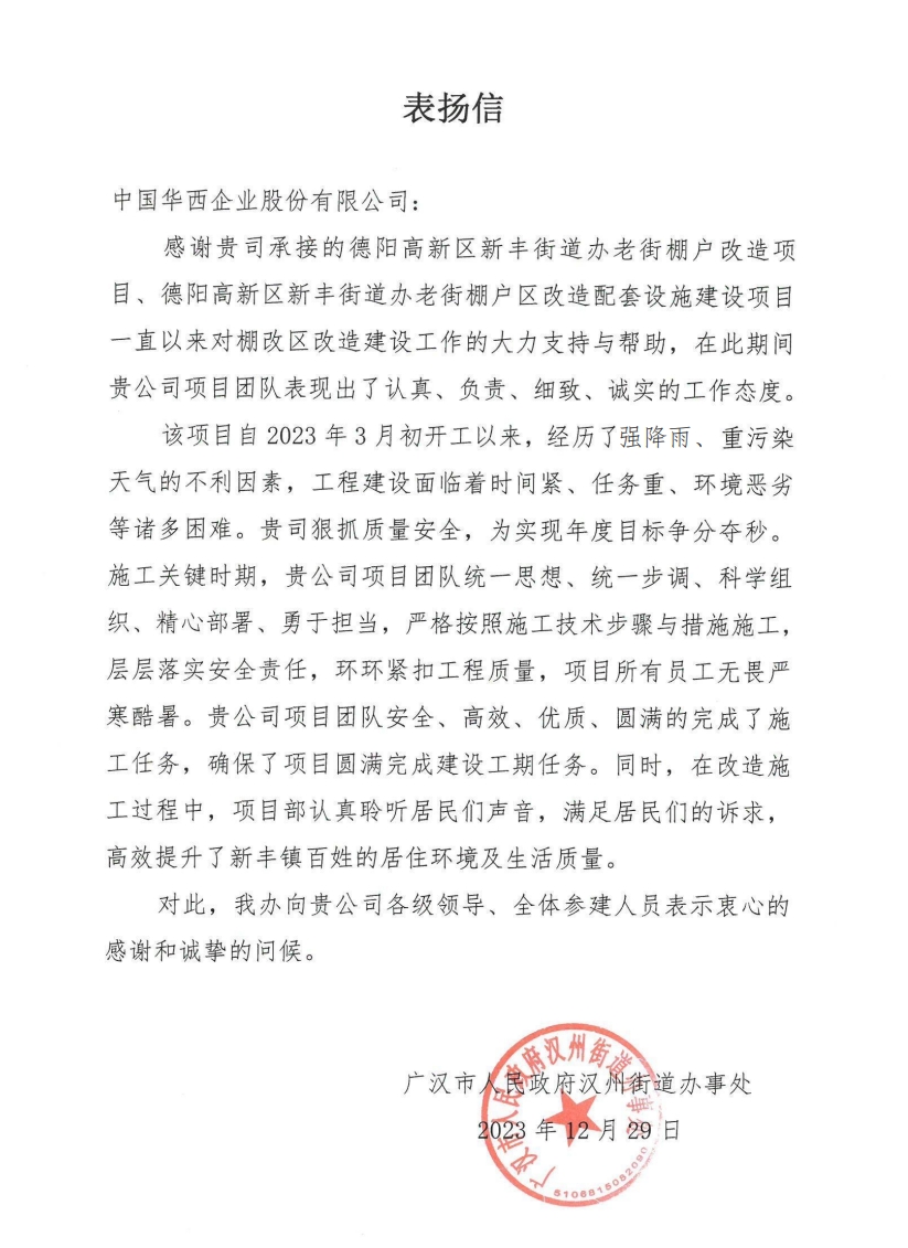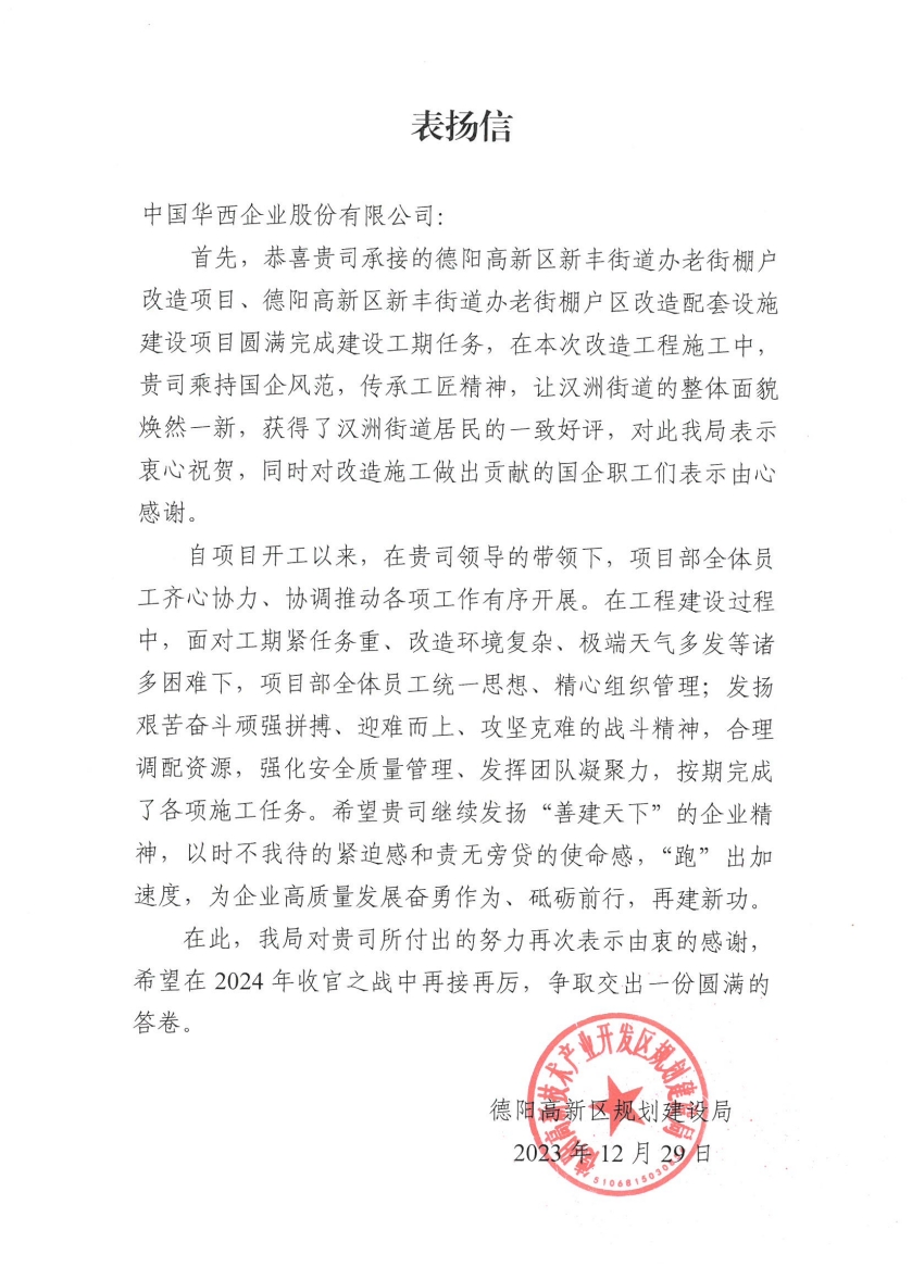近日,四分公司收到來自德陽高新區(qū)規(guī)劃建設局、廣漢市人民政府漢州街道辦事處、雅安華興房地產有限公司的3封表揚信,信中對德陽高新區(qū)新豐街道棚改項目、凱悅天地3期項目建設過程中的精心策劃、嚴密組織,項目團隊認真負責、嚴謹細致的工作態(tài)度進行了表揚,對華西十二公司積極配合完成各項施工任務表示衷心感謝。