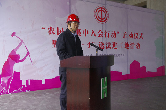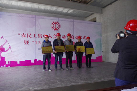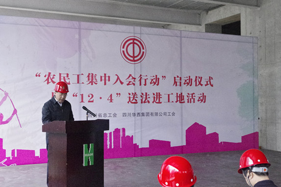 冬日的寒冷擋不住工會的溫暖,勞動的艱辛迎來了組織的關(guān)懷!12月3日,集團(tuán)“農(nóng)民工入會集中行動”啟動儀式暨“12.4”送法律進(jìn)工地活動,在公司“領(lǐng)地.環(huán)球金融”中心項目舉行。四川省總工會黨組成員、副主席胥純,四川省總工會法律部部長李長春,四川省總工會組織部副部長陳君;集團(tuán)公司黨委常委、工會主席武勇,集團(tuán)工會副主席李曉婷;公司工會主席、紀(jì)委書記楊萬智,工會副主席于冬梅及省總和集團(tuán)工會相關(guān)負(fù)責(zé)同志、集團(tuán)各單位工會主席同來至集團(tuán)各單位的、公司“領(lǐng)地.環(huán)球金融”中心項目的農(nóng)民工代表100余人出席和參與了此次活動。集團(tuán)工會副主席李曉婷主持會議。