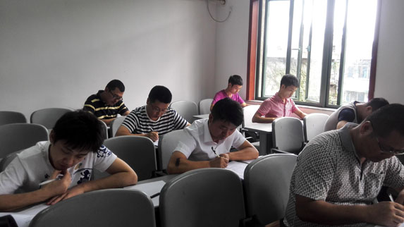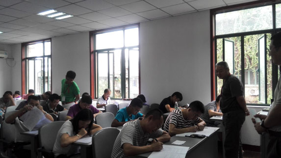 為端正考紀,嚴肅考風,技能大賽領導小組在考前組織召開了監(jiān)考人員會議,對監(jiān)考人員的安排和職責進行了確定。此次競賽規(guī)定各參賽人員在考試過程中嚴禁攜帶與考試有關的資料,手機一律關機放在考室內(nèi)指定位置,嚴禁用手機代替計算器,自備普通計算器參賽,并由工會出資購買了50部計算器,分發(fā)到各考場,以備不時之需。兩個科目的考試同時進行,歷時3小時,公司總經(jīng)理廖繼榮、副總經(jīng)理丁勇、工會主席楊萬智分別到各考場進行了巡視,查看各考場參賽人員答題情況和監(jiān)考人員工作情況??荚囋谥形?2點準時結束,各監(jiān)考人員收集齊試卷后,在考務辦公室進行了統(tǒng)一裝訂、密封。