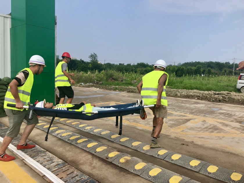 在完成阻水工作時,發(fā)現(xiàn)有人員受傷,搶險小組組長立即向總指揮匯報,總指揮立即命令醫(yī)療救護組前往現(xiàn)場,對受傷人員進行救治,并撥打120。醫(yī)療救護組組長葉威葳帶領(lǐng)醫(yī)療救護人員,迅速對受傷人員的傷口進行包扎,并將傷員小心扶至高處。120急救車到達現(xiàn)場時,兩名救護人員將傷員抬到急救車上,送往醫(yī)院進行救治。同時,項目安全總負責(zé)人顏長生帶領(lǐng)保衛(wèi)人員將其他人員引領(lǐng)到安全地帶,將便道入口拉上警戒線,進行保衛(wèi)。